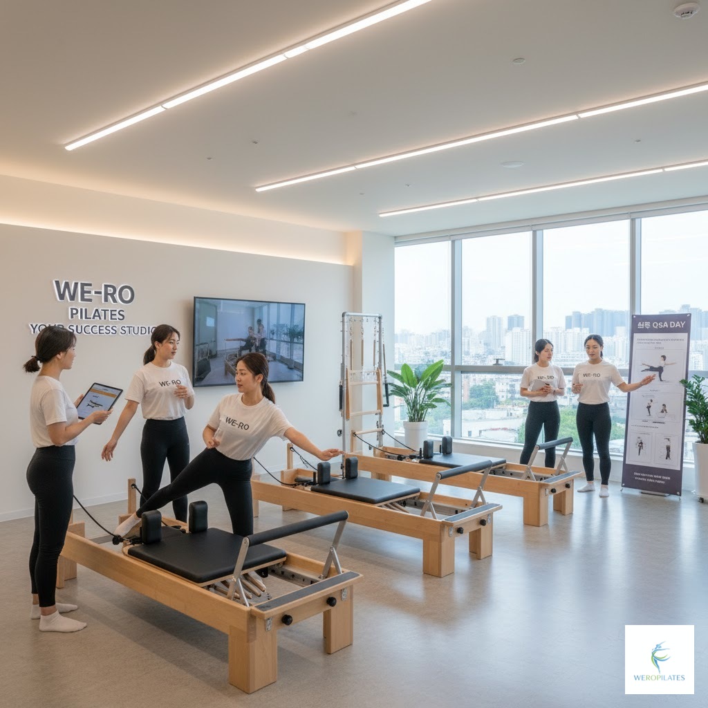 온라인 강좌 복습: 온라인에서 배운 매트 및 4대 기구(리포머, 캐딜락, 체어, 바렐) 동작을 직접 수행하며 완벽하게 마스터합니다.