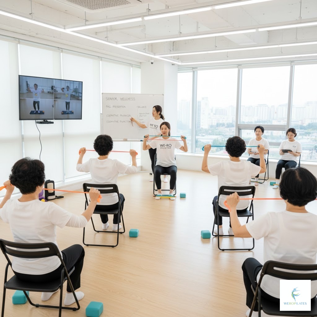 저희 위로(We-ro) 필라테스의 ''시니어 맞춤 매트 & 소도구 운동'' 35강 과정은, 바로 이 ''실무 현장''에 100% 초점을 맞춘 직업 능력 향상 프로그램입니다. 여러분이 어떤 환경에서도 자신 있게 수업을 리드할 수 있도록 ''의자''와 ''소도구''를 활용한 전문 지도법을 교육합니다.